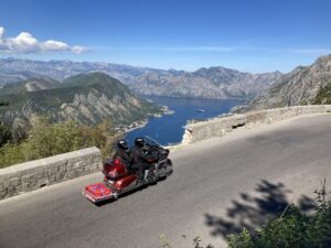 Es tut mir Leid immer das gleiche zu schreiben – aber Frühstück auf der Terrasse mit Blick auf Meer! Die Motorräder haben gesichert am abgesperrten Parkplatz des 4* Hotels genächtigt. Wir packen die Motorräder auf und begeben uns in die Bucht von Kotor! Ein Erlebnis diesen südlichsten Fyord Europas zu sehen! Die Bergstraße windet sich senkrecht über Kotor hinauf auf den Berg – immer die Aussicht auf die gewaltige Bucht von Kotor! Im Hinterland eine schöne Straße durch die Hügelwelt Montenegros. Quer durch die Hauptstadt Podgorica, gehts dann hinein in eine beeindruckende Moraca-Schlucht. Unglaublich wie sich hier das Wasser durch die Felswände gegraben hat. Foto Stopp, und weiter geht's! Über einen Pass fahren wir nach Kolasin und weiter direkt in die Tara-Schlucht! Urig, im Wald liegt unser nächstes Hotel. Landestypische Speisen und ein gutes Bier lassen den Tag ausklingen! Unglaublich was wir heute wieder gesehen und erlebt haben! Gute Nacht!