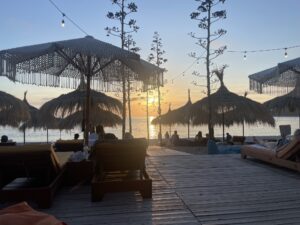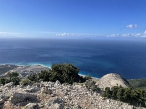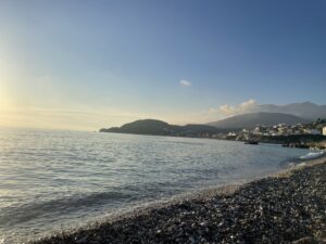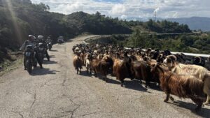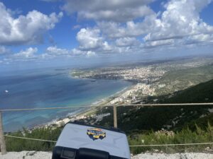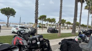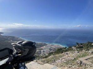 Frühstück direkt am Meer! Koffer packen und los geht’s! Entlang der Küstenstraße, kurvig, gut ausgebaut. Die Kehren auf den Maja Qores sind von weitem zu sehen! Bergstraßenspaß in Albanien. Und herrliche Ausblicke auf die Küste!! Kaffee trinken an der Flaniermeile von Vlorë. Moderne Stadt vorne am Meer, hinten im Vorort reiten die Menschen auf Eseln!?!?