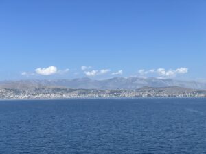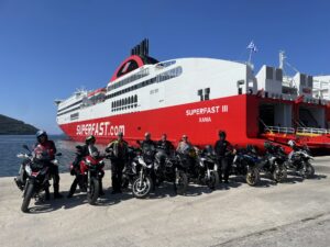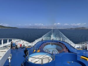 Nach der Nacht auf der Fähre frühstücken wir an Bord! Das italienische Festland ist zu sehen und die Fähre bewegt sich in Richtung Griechenland. Vorbei an der Insel Korfu geht’s am frühen Nachmittag hinein in den Hafen von Igoumenitsa. Runter von der Fähre – endlich wieder am Motorrad!!