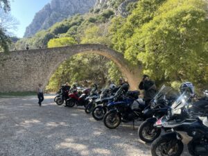 Wir starten aus der Tiefgarage des Hotels, es geht Richtung Nord-Osten. Schon bald steigen wir wieder in die Bergwelt ein, kommen über den Katara Pass an einem Skigebiet vorbei. Trinken einen Kaffee in Metsovo. Am Pamvotida-See bei Ioannina machen wir einen Foto-Stopp. Unsere Tour führt nun in ein Gebiet das schon an Albanien grenzt. Die Straßen die ich hier ausgewählt habe werden teilweise von der Natur zurück erobert. Enge, kurvenreiche Abschnitte, mit kurzen Unterbrechungen des Asphalt warten auf uns. Es ist aber landschaftlich ein Erlebnis. Beim Mittagessen mitten in der Bergwelt zwischen Griechenland und Albanien musste ich beim ersten Mal den Einheimischen den Weg erklären den wir genommen haben! Ungläubig müssen sie zugeben das es doch möglich ist so ins kleine Dorf Charavgi zu gelangen.