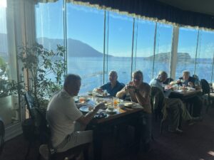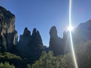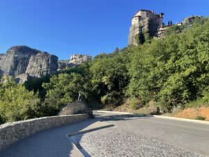 Nach dem perfekten griechischen Abend starten wir mit einem Frühstück, Blick aufs Meer! Dann Motorräder fertig machen und los geht’s!! Wir fahren zuerst entlang der Küste, biegen aber dann ab in die Berge! Griechenland, ab sofort anders als es das Klischee beschreibt. Bergwelt, Schluchten, Staumauer, Kurven und Kehren. Es macht Spaß, aber immer auf die Straße achten! Immer wieder liegen Steine auf der Straße. Kaum Verkehr, es scheint wir sind allein unterwegs. Mittags halten wir in den Bergen, essen typisch griechisch, bevor es weiter geht. Am Nachmittag erreichen wir das breite Tal, das uns bis Kalambaka bringt. Bevor wir die skurrile Bergwelt und die Meteora Klöster besuchen checken wir im Hotel ein. Die „Klosterrundfahrt“ nehmen wir ohne Gebäck, sind es doch nur ca. 20 Kilometer.